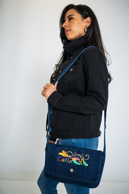 Botanical Dragonfly Dark Blue Zipper Top Denim Purse
